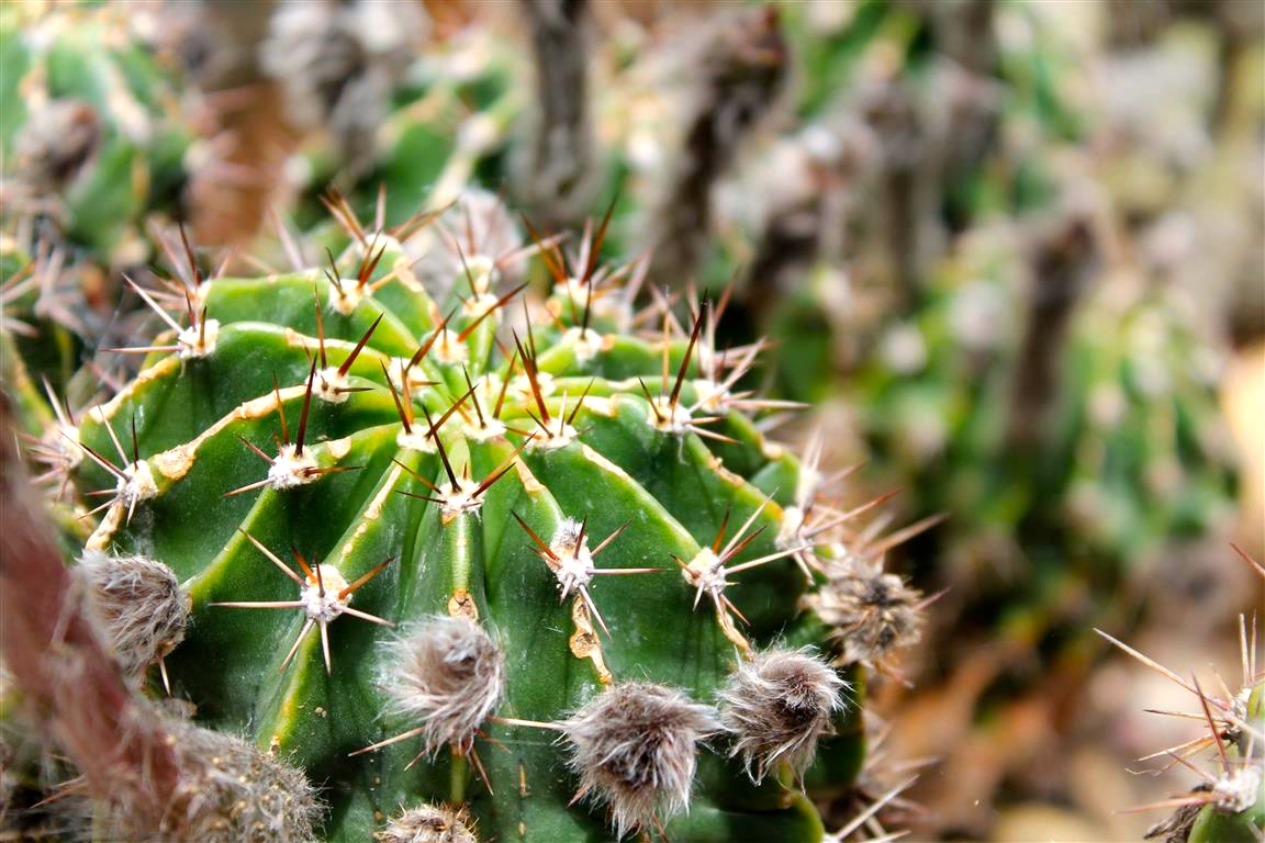 Closer inspection on the short cacti plant, it has little course black hairs which are more apparent when the flower is a bud.